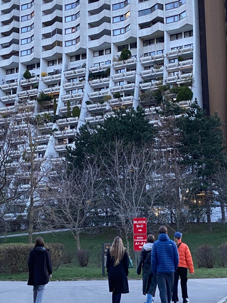For our next site, we took the metro to Alt-Erlaa on the outskirts of Vienna to see a striking example of modernism in a well-functioning residential complex built in the 1980s. Such a complex can be considered a mini city with about 10 000 inhabitants, with living units, public functions – schools, church, dining, library, gym, spa complexes, kindergartens, etc. The complex offers many opportunities for leisure and it was pleasant to walk between the houses, which served as a park. We also chatted to a local resident who has rented an apartment there for 40 years. Interestingly, there are only rental apartments in the complex. According to the local, there is a long queue to get an apartment, sometimes as long as 3 years, and it is very popular with families with children. In our own project, we saw how it is also possible to design such large and high volumes in a grid, with fixed modules and elements.