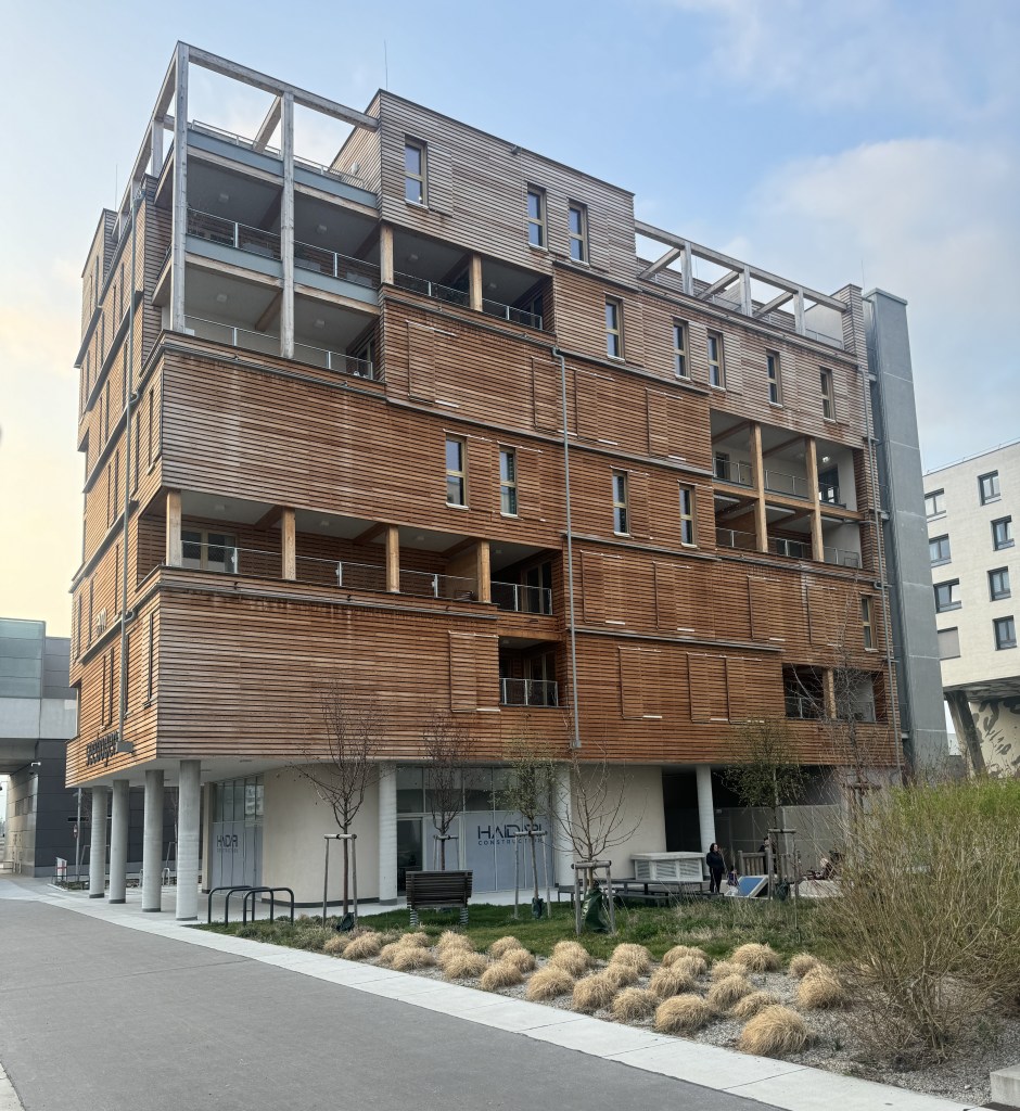 The Forum am Seebogen is a building completed in 2022 in the Seestadt Aspern district, currently an emerging area for new office and residential buildings. The building was designed with a load-bearing frame and modules, but the reality was that the modules had to be disassembled into elements. The project was the winning entry in the competition, and the terms of reference already stipulated that the building components had to be prefabricated in the factory, with a construction time limited to six months. The proportion of living space had to be a maximum of 80%, as the building had to integrate office space as well as a forum with a public function.
