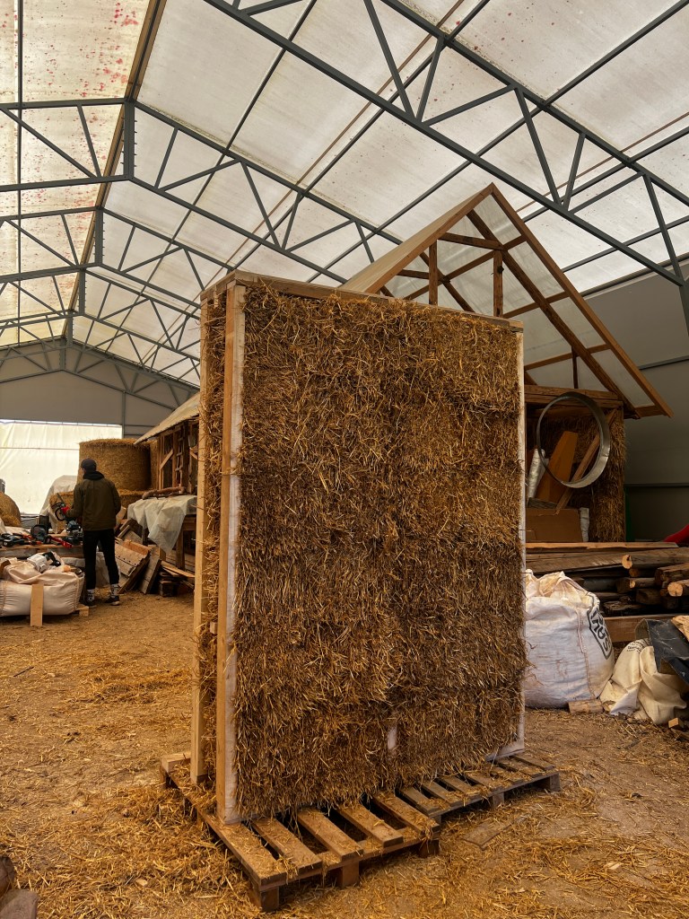 Kuigi Arvamusfestival toimub augusti teisel nädalavahetusel, siis põhulava ehitustöödega alustasime mai keskpaigast. Selle osas tuli meile vastu Sven Aluste, kelle juures Paide lähistel saame ehitada, et ehituse jaoks vaja minevate elementide transport oleks ehitusplatsile võimalikult lähedal. Kuna installatsioon koosneb põhupaneelidest, siis saame need varasemalt valmis ehitada ning ehitusplatsil elemendid kokku panna. Sarnane loogika nagu ka meie uurimistöö puhul. Juba mais me alustasime ehitamisega selle tõttu, et enne kindlate jooniste tegemist saaksime läbi katsetada täpsemalt kui palju me saame põhku kokku pressida, peale mida on paneeli mõõdud paigas.