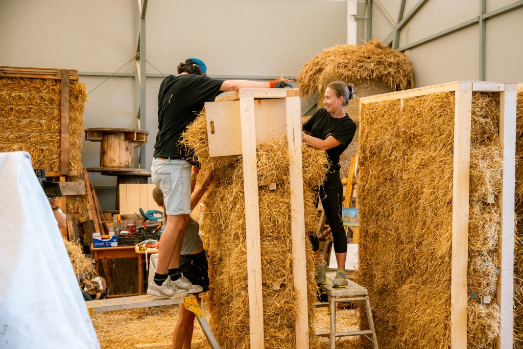 Paneelide, vundamendi, katuse ehitus, paneelide transport, tõstmine ja kinnitamine – just sellistest etappidest koosneski installatsiooni ehitus. Kogu ehituse vältel oli meile abiks loodusehituse koolitaja Sven Aluste. Põhupaneeli ehitusest saite täpsemalt lugeda eelmisest blogi postitusest. Ainus asi, mis ehituse puhul muutus oli puitkonstruktsioon, kus ikkagi lõpuks me tappühendusega edasi ei liikunud, sest katuse jaoks seda enam vaja ei olnud. Kokku oli vaja ehitada 8 paneeli, millest põhuga täidetud oli 6 ning ainult puitkonstruktsiooniga 2. Testpaneeli ehitusega saime ühe valmis, loodusehituse koolituse kaudu sai teine paneel valmis. Järgneva kuue paneeli puhul ei lähtunud enam paneeli keskselt vaid just tööülesannete järgi. Alustasime kõikide paneelide puitkonstruktsiooniga, siis põhuga täitmine, põhuseinte trimmimine ning viimaseks osaks oli diagonaalide kinnitamine põhu sisse tehtud soontesse.
