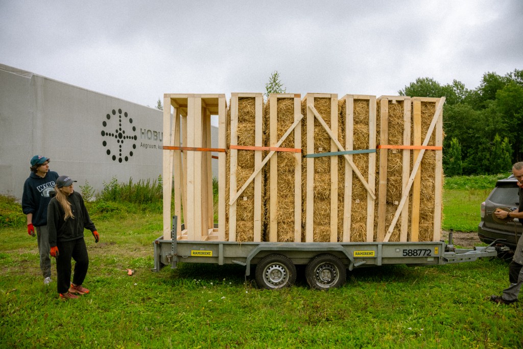 The construction of the panels, foundation, roof, transportation, lifting and fixing the panels to the foundations – these are the stages of the installation. Through all of the steps we got a lot of help from our mentor Sven ALuste. You can read more about the construction of the test panel in the previous blog post. The only thing that changed in the construction was the timber structure, where we still ended up not going ahead with the joint connection as it was no longer needed for the roof. In total, 8 panels had to be built, of which 6 were filled with straw and 2 with only the timber structure. With the test panel construction we completed one, with the natural building training we completed the second panel. The next six panels were no longer based on the centrality of the panel, but just on the tasks at hand. We started with the timber construction of all the panels, then filling in the straw, trimming the base walls and the final part was fixing the diagonals into the grooves made in the straw.